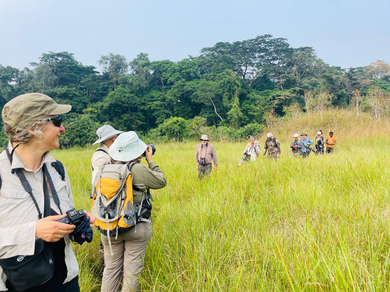 Un groupe de 5 part avec Héloïse pour la pose d’un piège photo, trois s’arreteront en route pour des photos et des observations ornitho. Franck et Frédéric continueront jusqu’au champ de manioc pour l’installation du piège photo qui sera récupéré mardi avant de quitter Lempu.