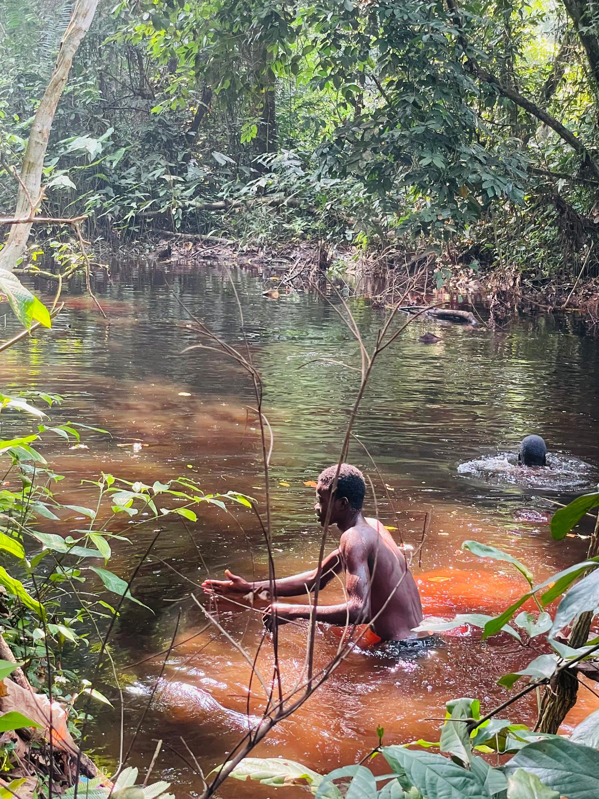 Pour occuper la matinée nous partons en repérage dans la foret dite mosaïque (alternance foret et savane). De très beaux décors s’offrent a nous. Passage de rivière plus ou moins marécageuse. Une belle piscine naturele se détache soudainement dans cette destinée forestière. 2 enfants en profitent pour faire en plongeons et une petite nage.