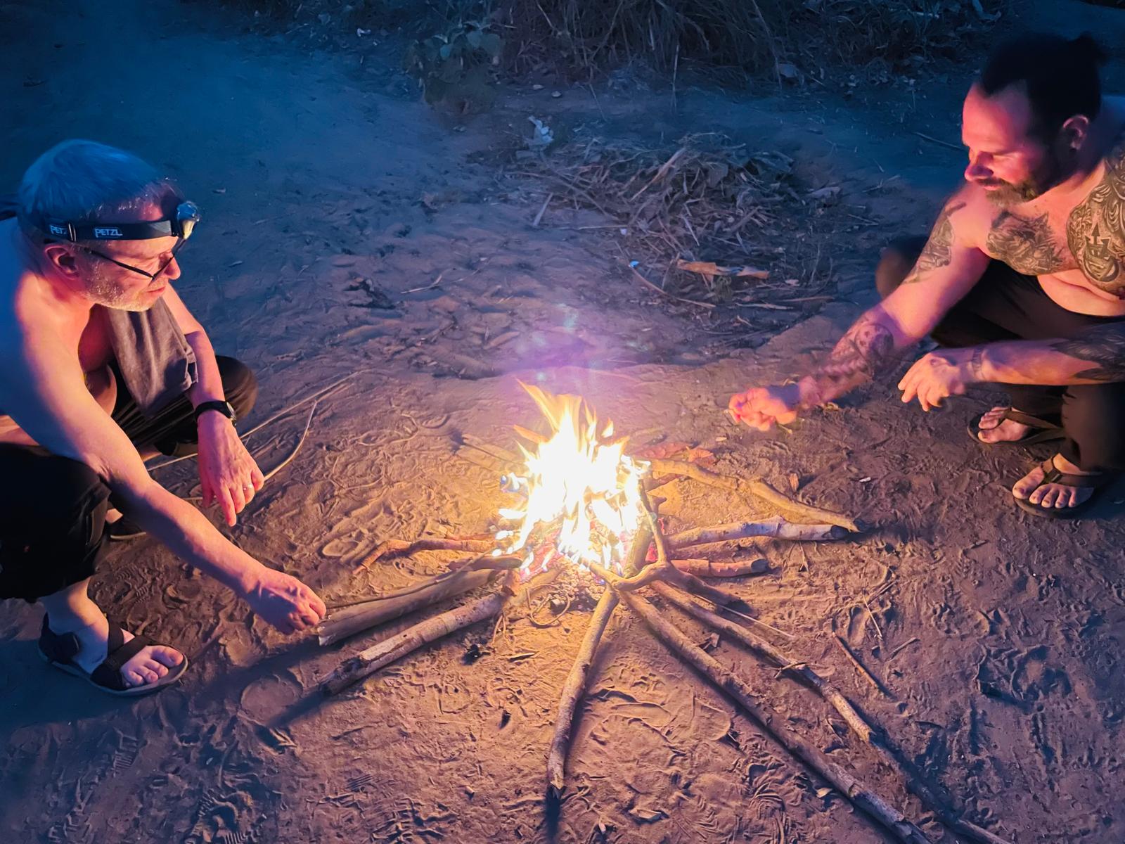 La soirée s’achève autour du feu avec le partage de nos pains avec les enfants.