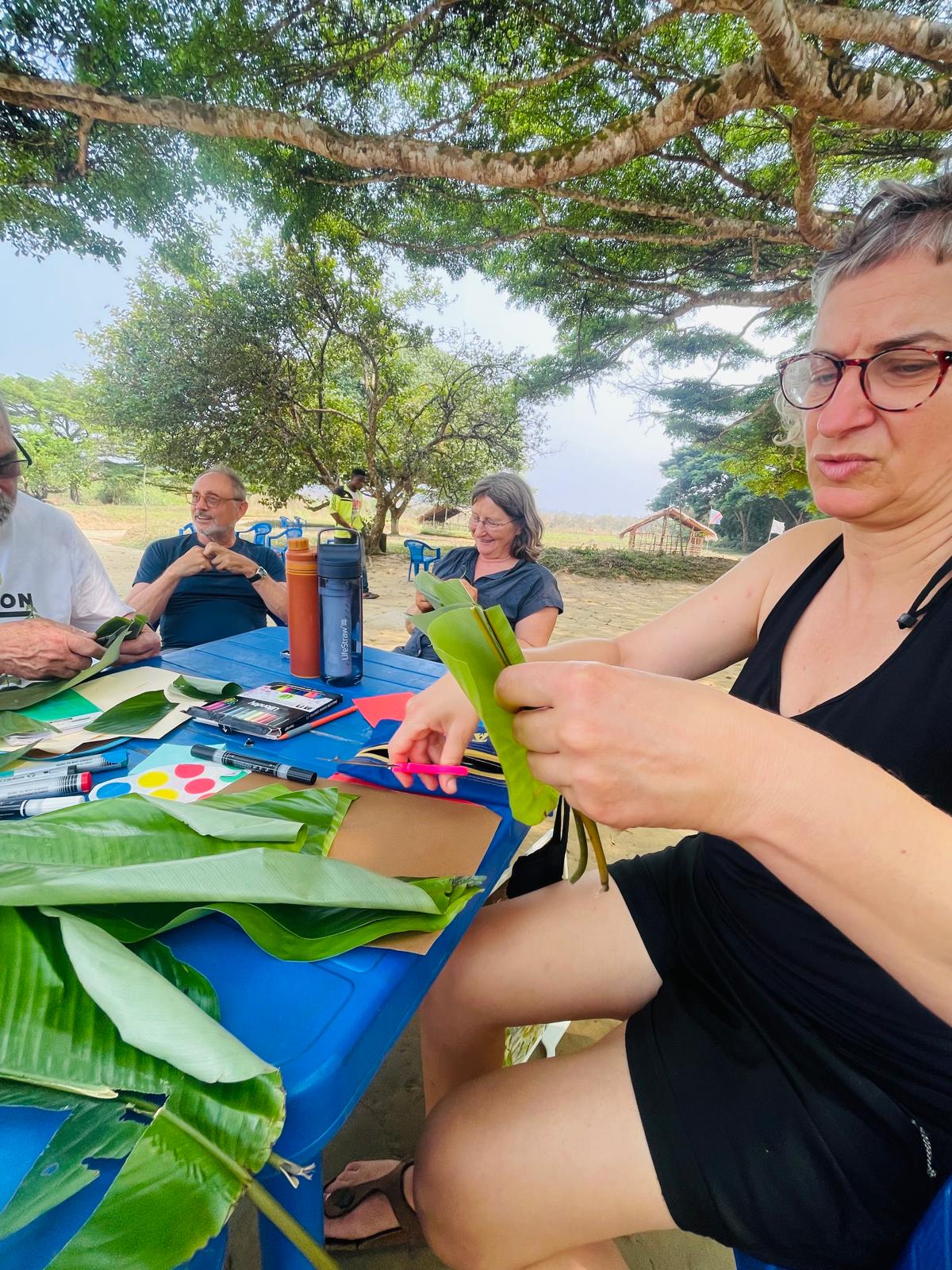 Petit atelier carnet en feuilles de marantacées (les bonobos raffolent de leurs tiges) et dernier moment pour finaliser le poster, la restitution se passera au village de Nkala après la danse que les villageois partage à chaque fois pour raconter la légende du bonobo.