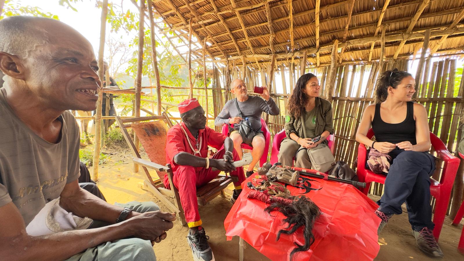 Le chef nous fait l’honneur de nous recevoir. Aujourd’hui journée sacrée, nous serons protégés par des symboles. Il reçoit nos cadeaux pour son village et des noix de Cola pour lui donner de la force.