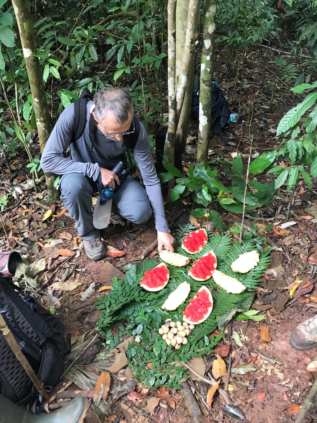 Ensuite, les guides ont dressés la table composée de feuilles et fougères et ont présentés des fruits exotiques (pastèque, ananas et une nouvelle variété de petit fruit).