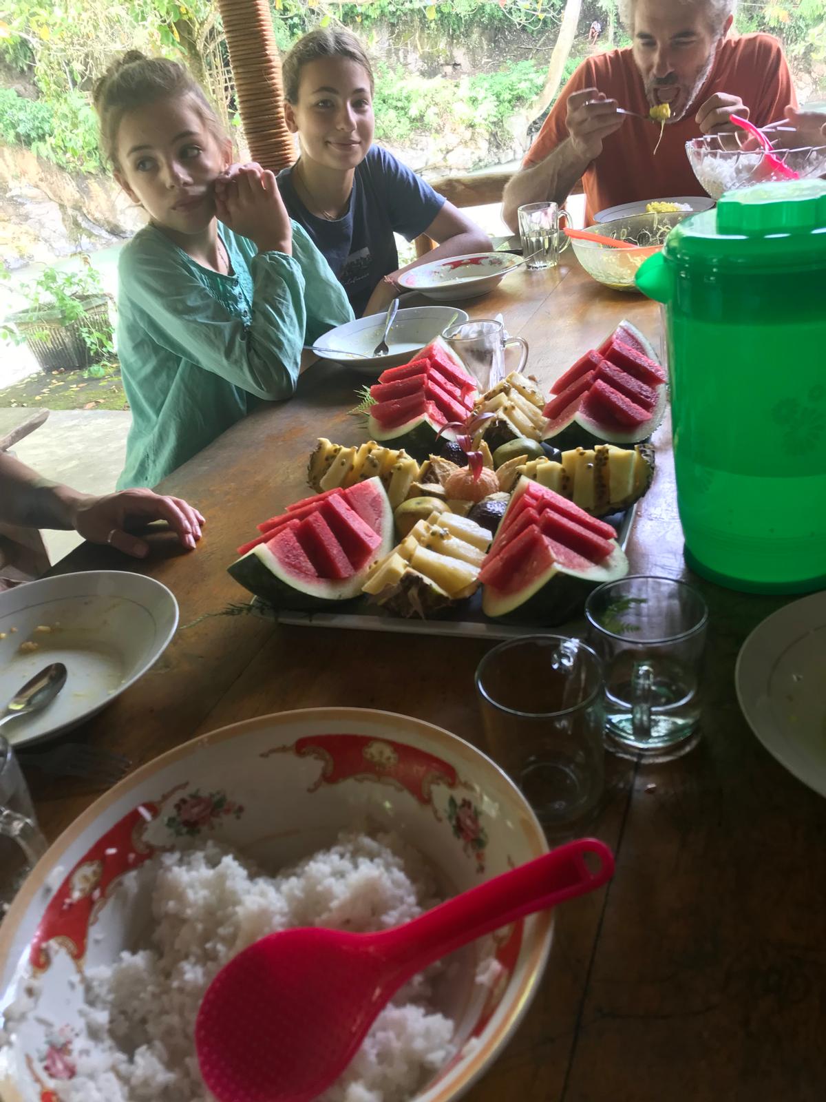 Premier repas délicieux ensemble (poulet, légumes façon indonésienne) et le summum du délice l’énorme plateau de fruits frais ! Sieste obligatoire pour les uns et évaluation CNED pour Ella et Anais en Home school.