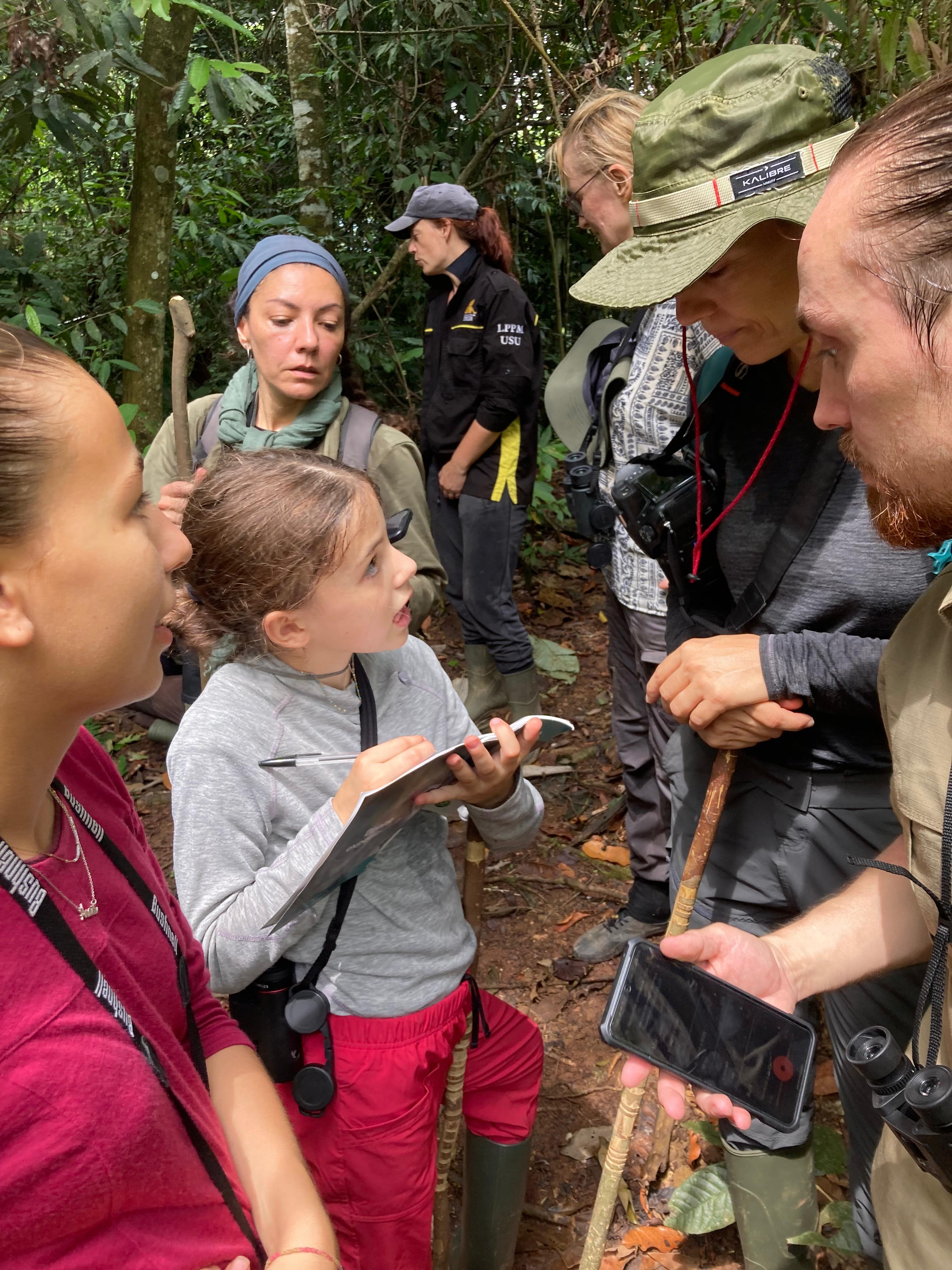 Premières observations d’un nid d’Orang-Outan, des Macaques à longue queue aux abords du village de Batu Katak, ainsi que d’un Aigle noir et d’un Ecureuil géant volant. Ces observations ont valu un relevé GPS et les notations de notre scribe, Ella.