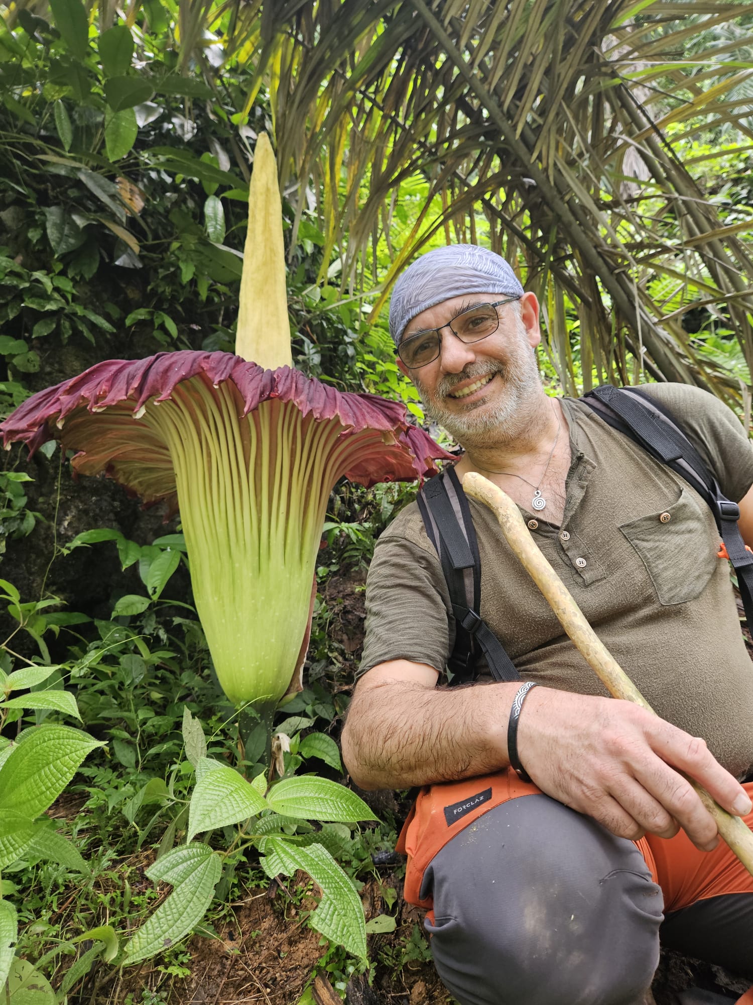 Pendant la descente, nous avons observé une fleur en formation, l’Amorphophallus titanum endémique et emblématique de Sumatra. Celle-ci est la plus grande fleur du monde, avec une hauteur de 3 m.