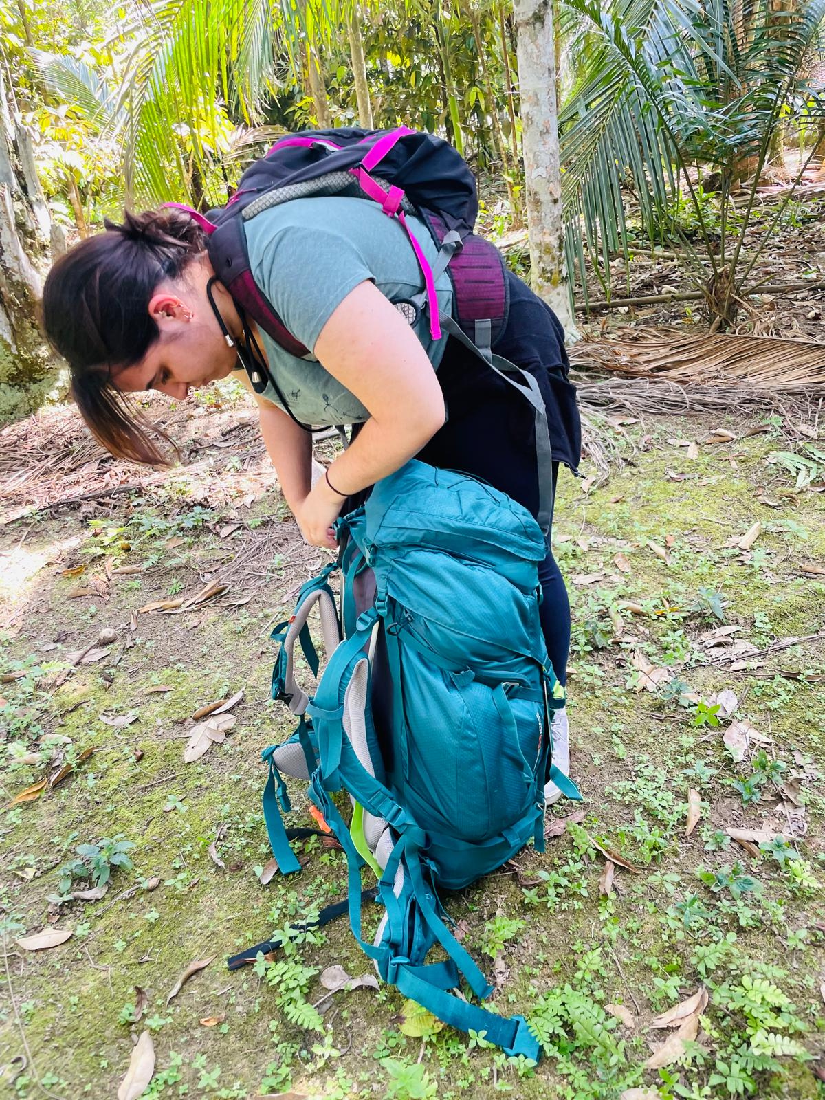 Arrivée au camp où l’on dépose tous nos sacs et découverte de deux grands abris qui nous servirons de toit pour les deux prochaines nuits. Nous repartons (allégés) en expé forêt. Déjeuner copieux et délicieux à l’ombre, dans une ancienne base scientifique.