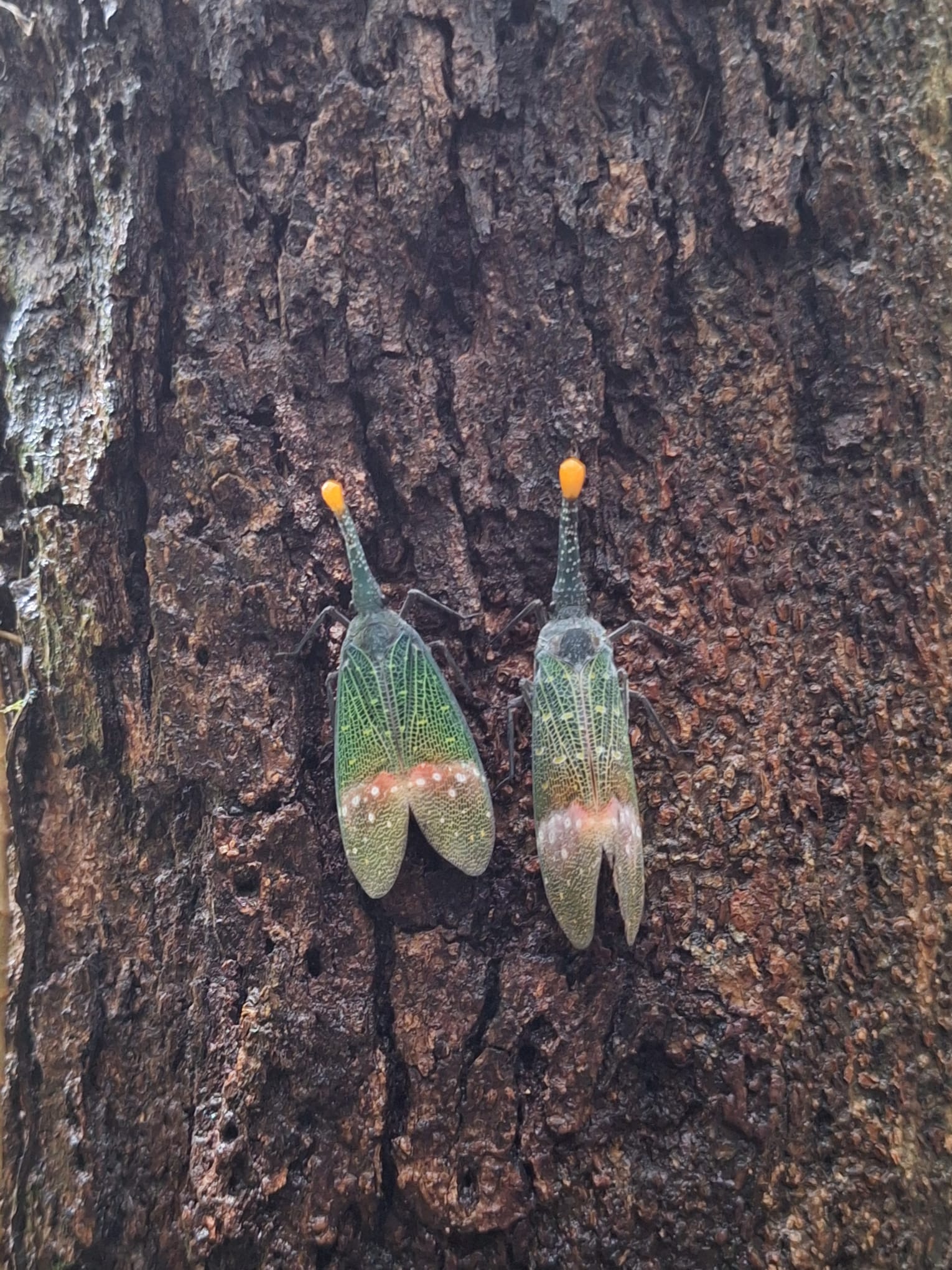 En chemin nous découvrons sur un tronc 5 Pyrops Pythicus, des insectes avec une trompe très colorées.