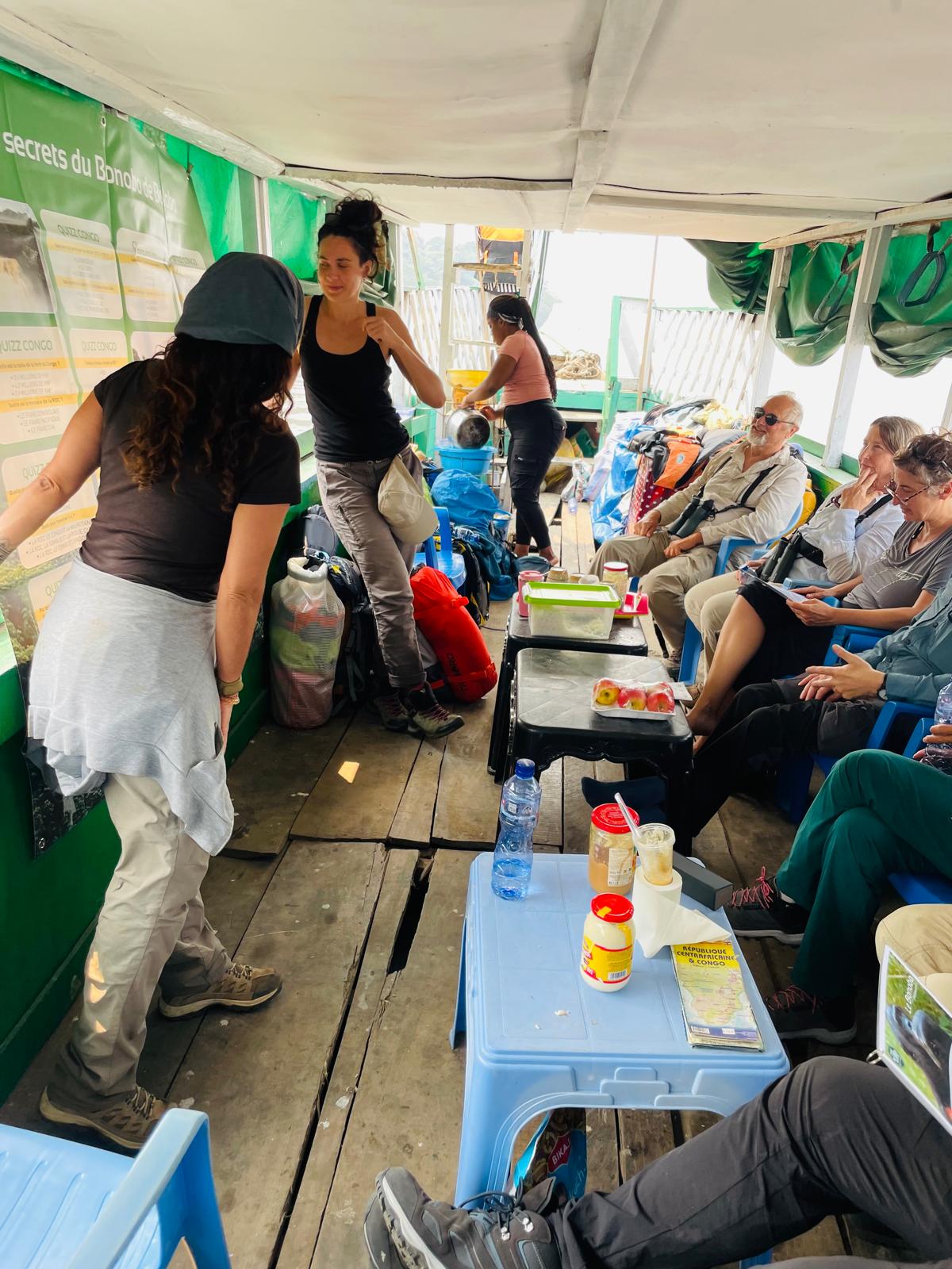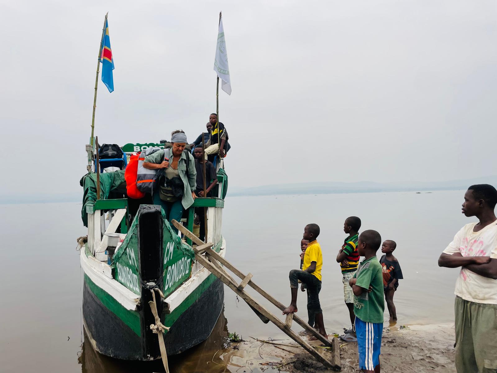 Pendant cette journée complète de pirogue petit quiz sur le bonobo et le seul endroit où il habite, La RDC ! avec des magnifiques paysages … autour de nous … sauvages, quelques petites pirogues de pêcheurs et des énormes baleinières avec des centaines de personnes à bord.
