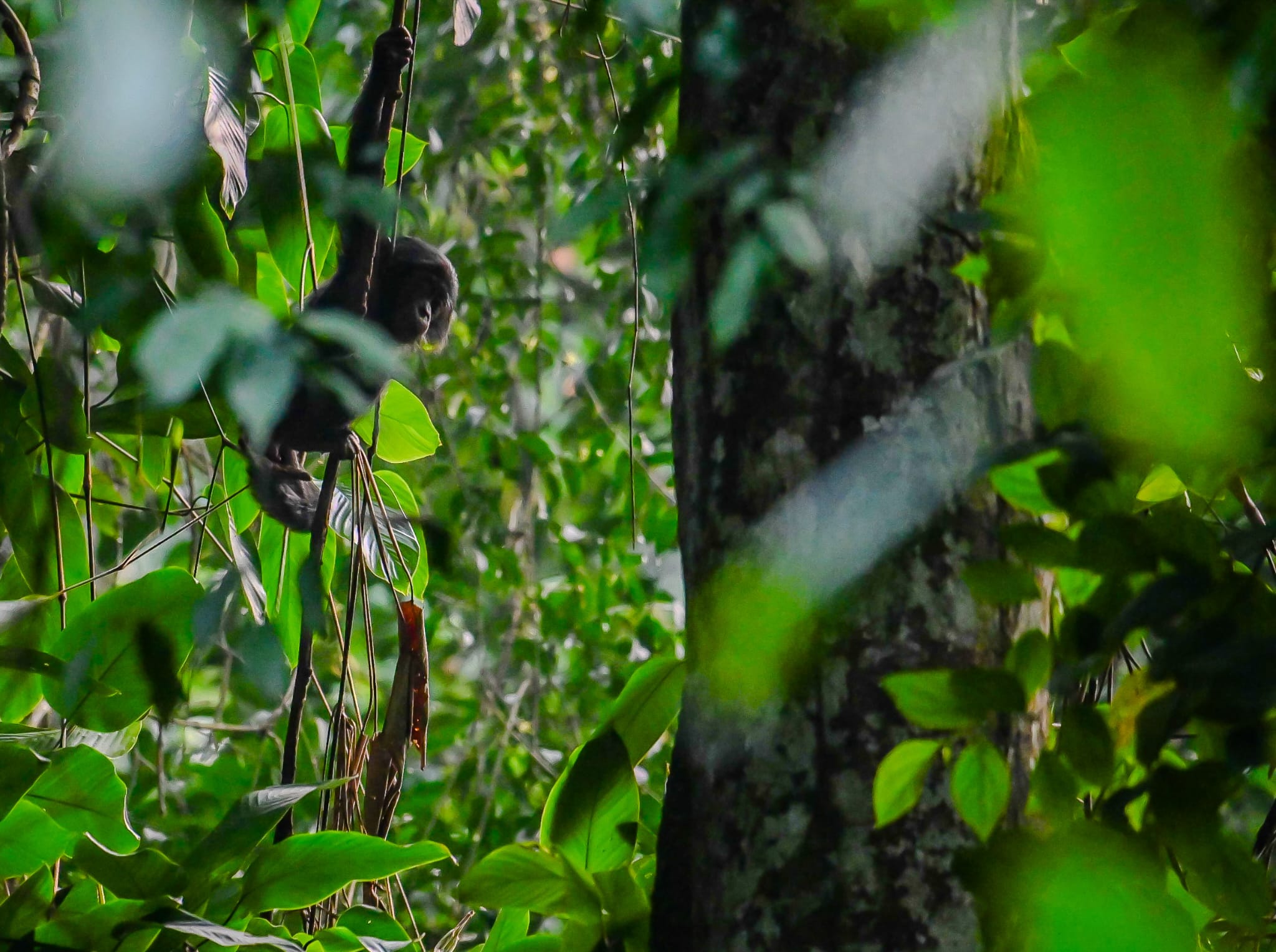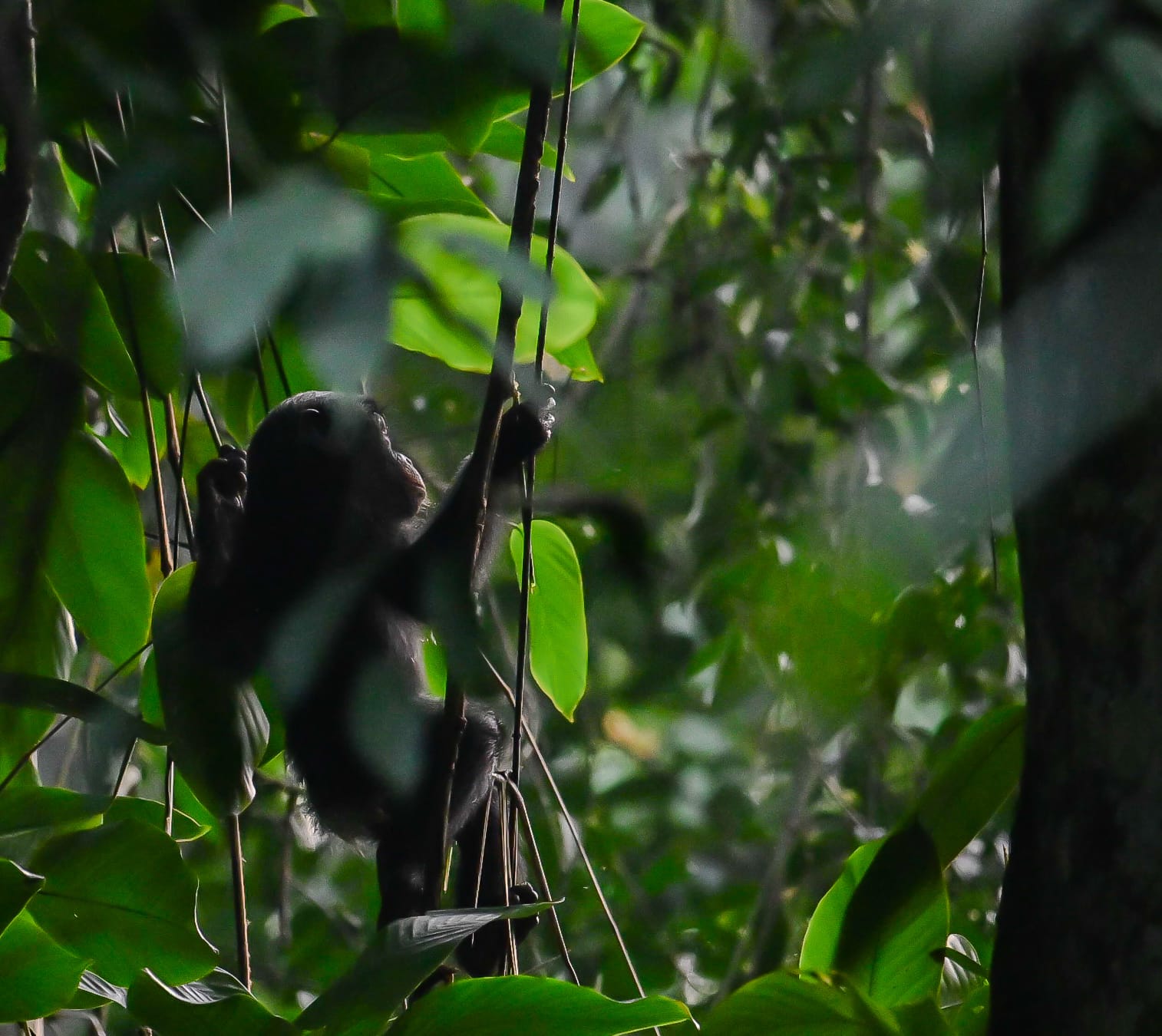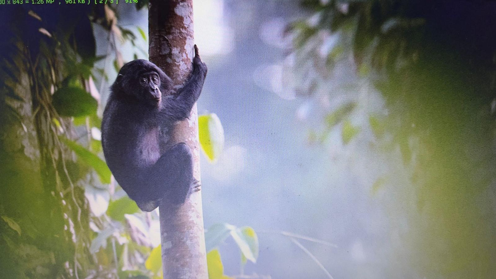 Waaaa la famille de bonobo se réveille une dizaine d’individus de tout âge et de tout sexe. Ils évoluent dans un arbre que l’on appel le parasolier qui est l’arbre favoris des bonobos . Nous sommes resté 1h30 à effectuer le protocole.