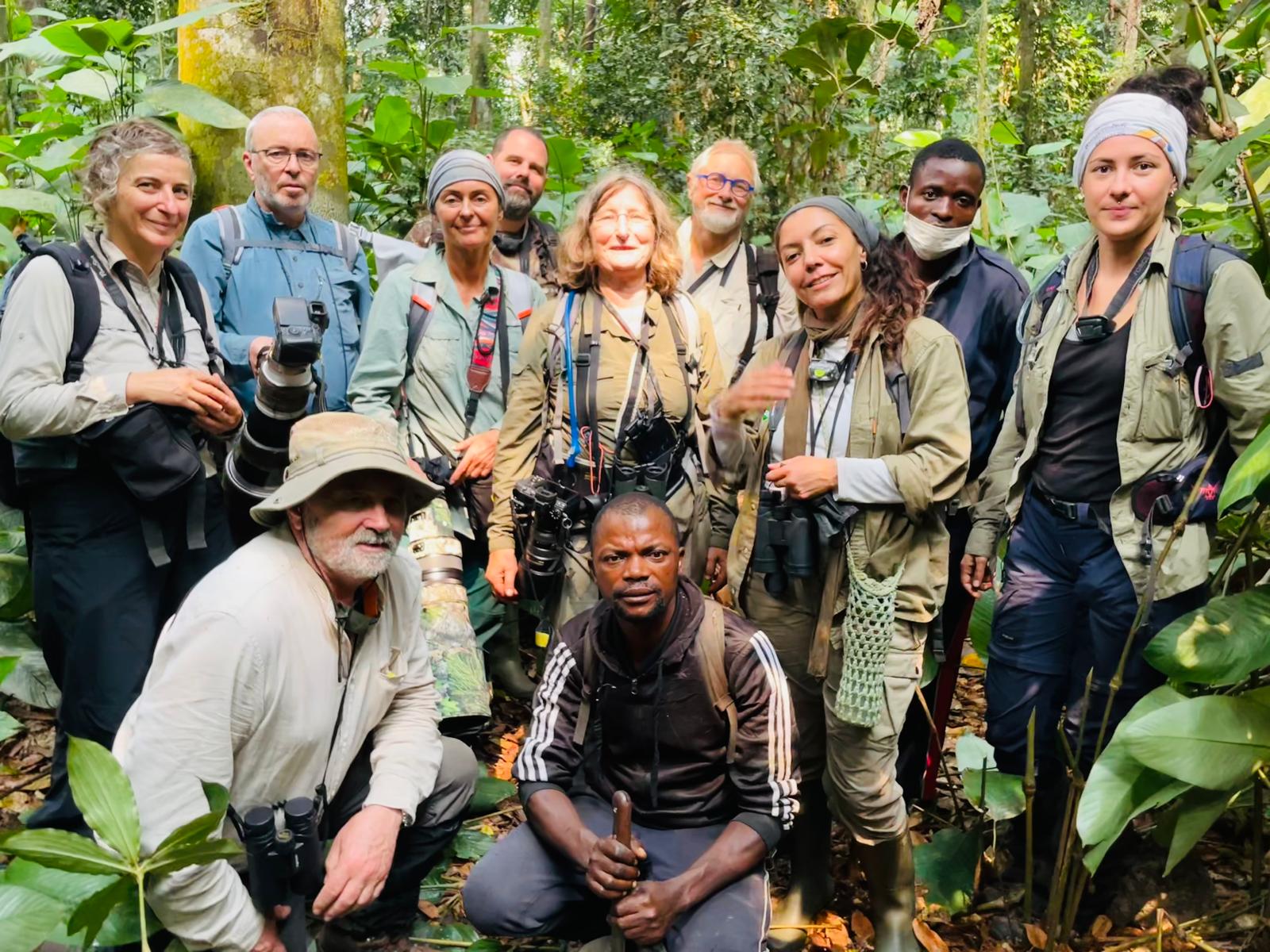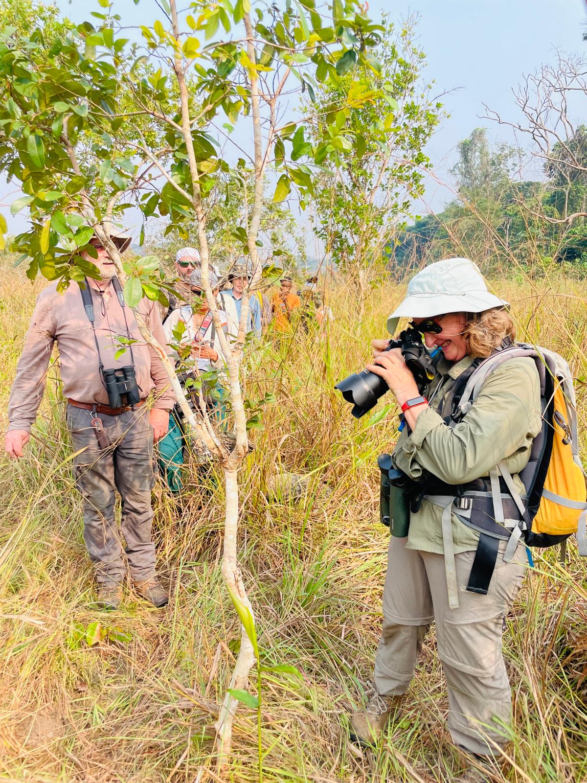 Un groupe de 5 part avec Héloïse pour la pose d’un piège photo, trois s’arreteront en route pour des photos et des observations ornitho. Franck et Frédéric continueront jusqu’au champ de manioc pour l’installation du piège photo qui sera récupéré mardi avant de quitter Lempu.