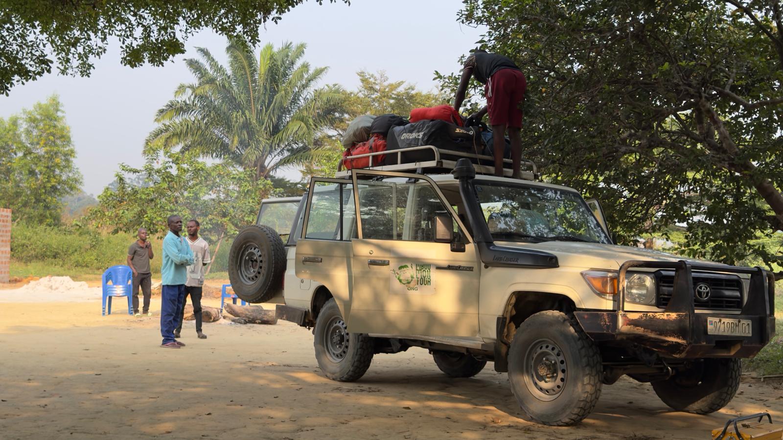 Les pisteurs nous ont dit que les Bonobo étaient à 1h de marche, une demi-heure de jeep. Nous avons décidé de nous lever vers 3h30. Nous sommes partis à 4h10. Chacun a géré son réveil et tout le monde était présent à 4h10. Nous avons fait un Tetris corporel dans la jeep et nous nous sommes rendu au point de rencontre des pisteurs.