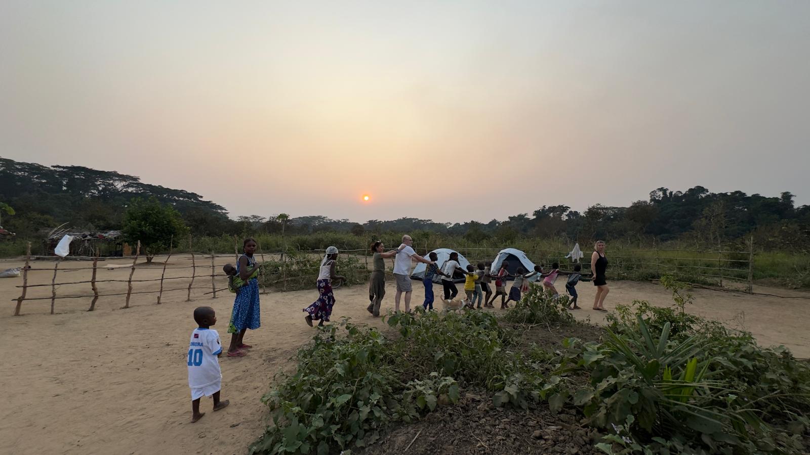 En route nous faisons un arrêt au village Nko pour soigner Franck au breuvage Universel... coca cola Maite a partagé une danse avec les enfants ! Ensuite retour au camp. Lavage de corps et de linge ! Repas et sieste bien mérité ! Freddy fait sa lessive pendant que Gildas construit un mur avec les locaux ! On termine la